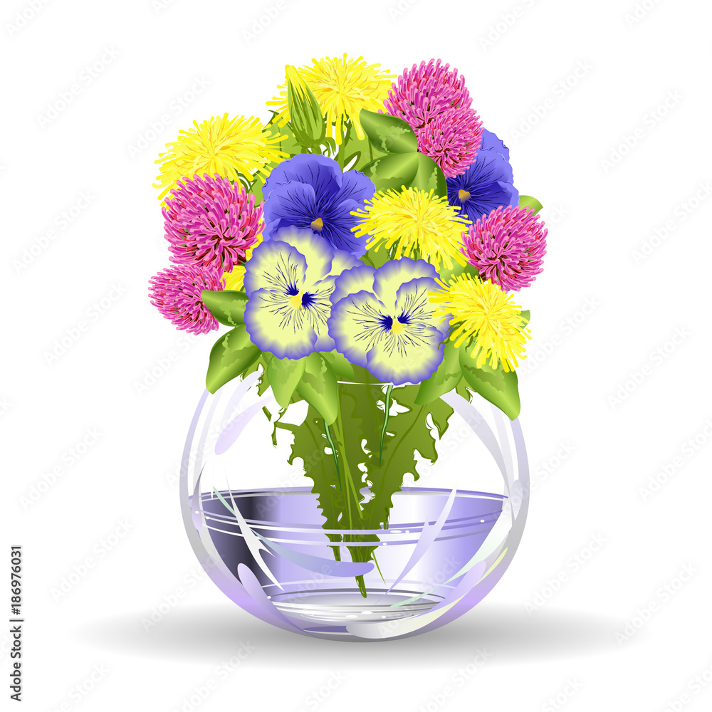 Spring Flowers Hand Drawn Realistic Vector Illustration On Yellow Dandellions Purple Clover And Blue Viola Flowers In Glass Vase On White Background Stock Vector Adobe Stock
